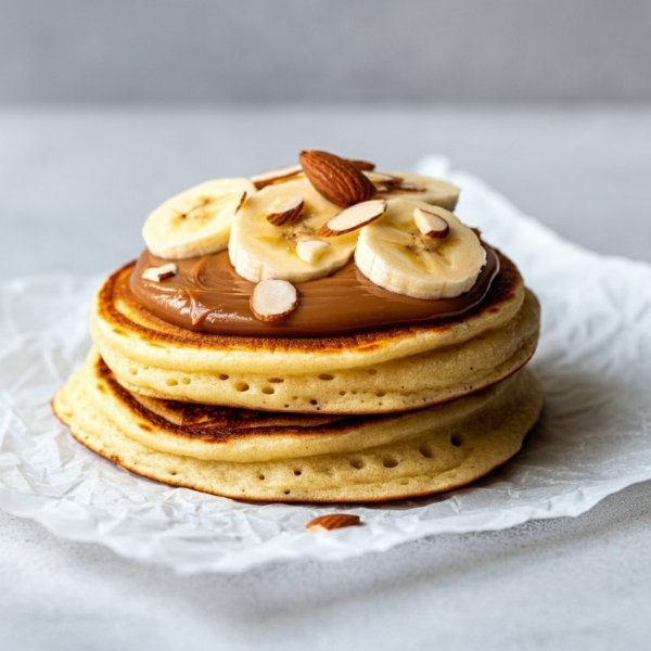 Hotcakes tradicionales de harina de trigo con cajeta, rodajas de plátano y almendras acompañados con miel de maple (aparte).