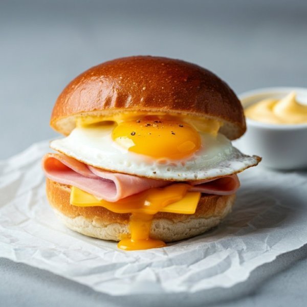 Sándwich en pan de papa con huevo estrellado, jamón york, queso cheddar y salsa holandesa (aparte).