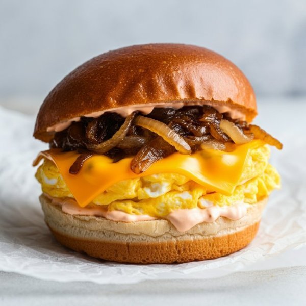 Sándwich en pan de papa con huevo revuelto, queso cheddar, cebolla asada y salsa Eggy.