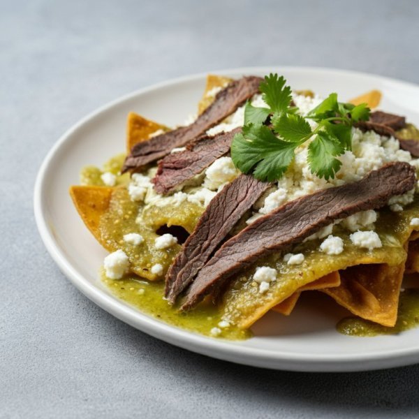 Chilaquiles Verdes con arrachera y toppings a elección (la salsa se envía aparte).