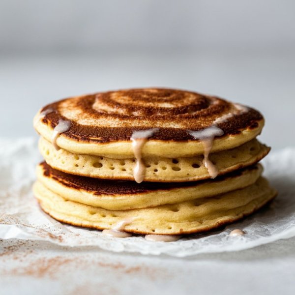 Hotcakes tradicionales de harina de trigo con azúcar, canela y glaseado acompañados con miel de maple (aparte).