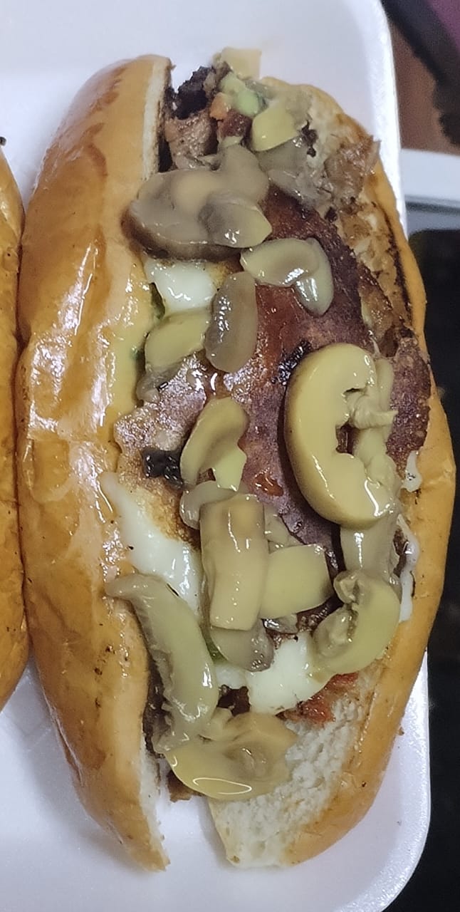 Pan Brioche , carne Asada, costra de queso, guacamole, champiñones al ajillo y pepperoni.