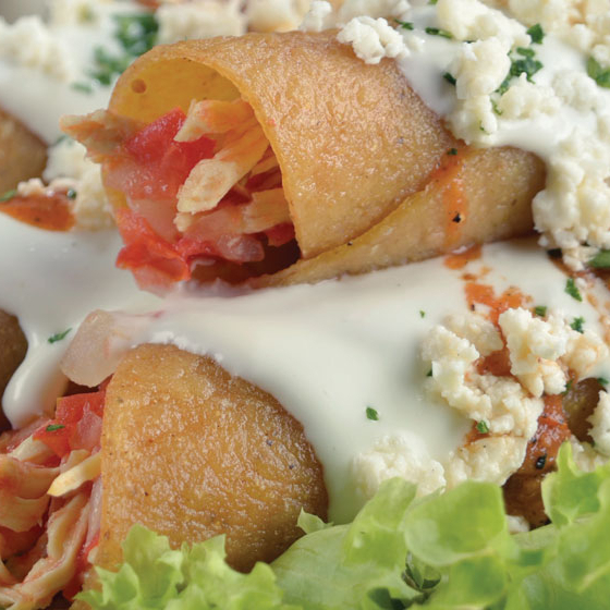 Taquitos dorados rellenos de aderezo tampico, acompañados con aderezo ranch y parmesano