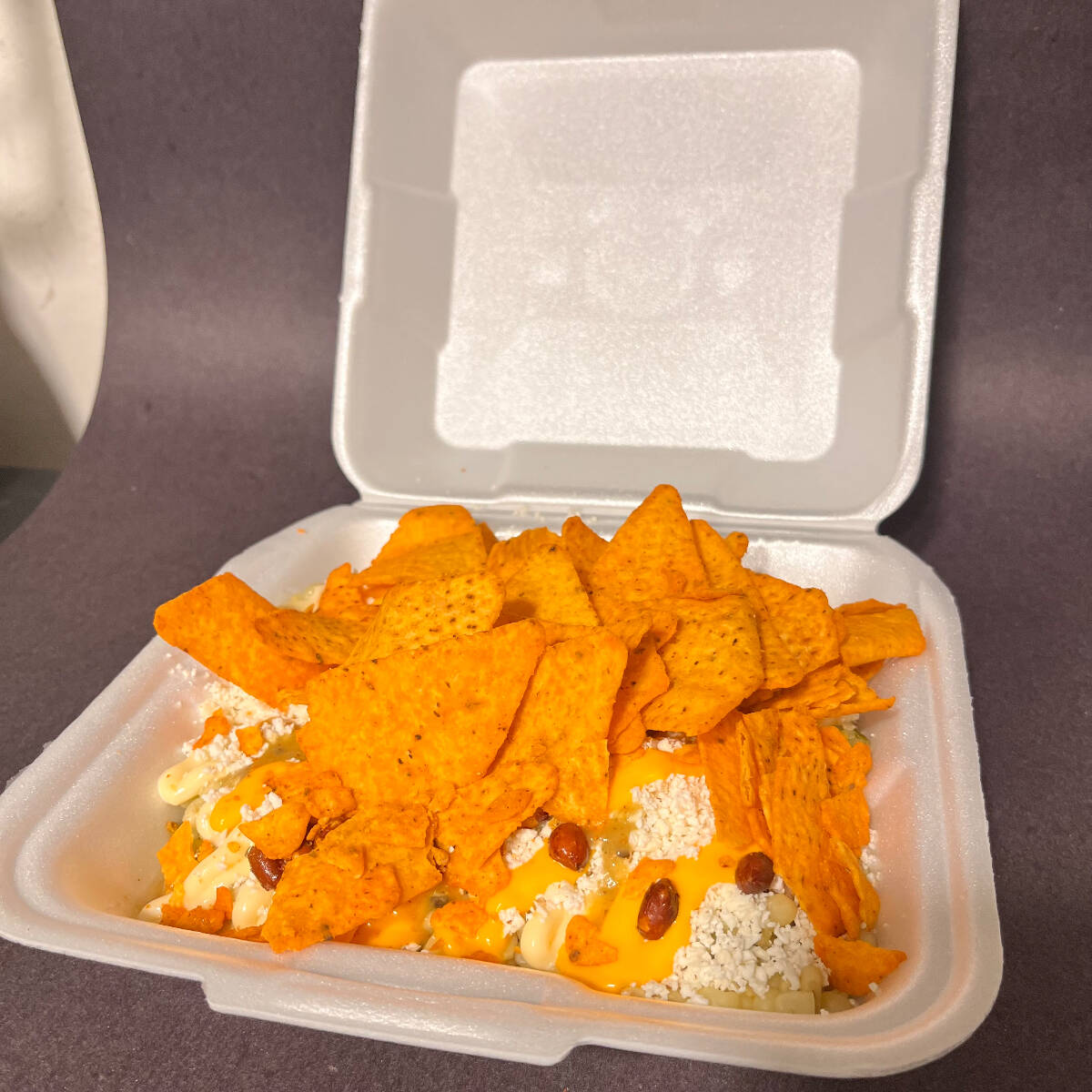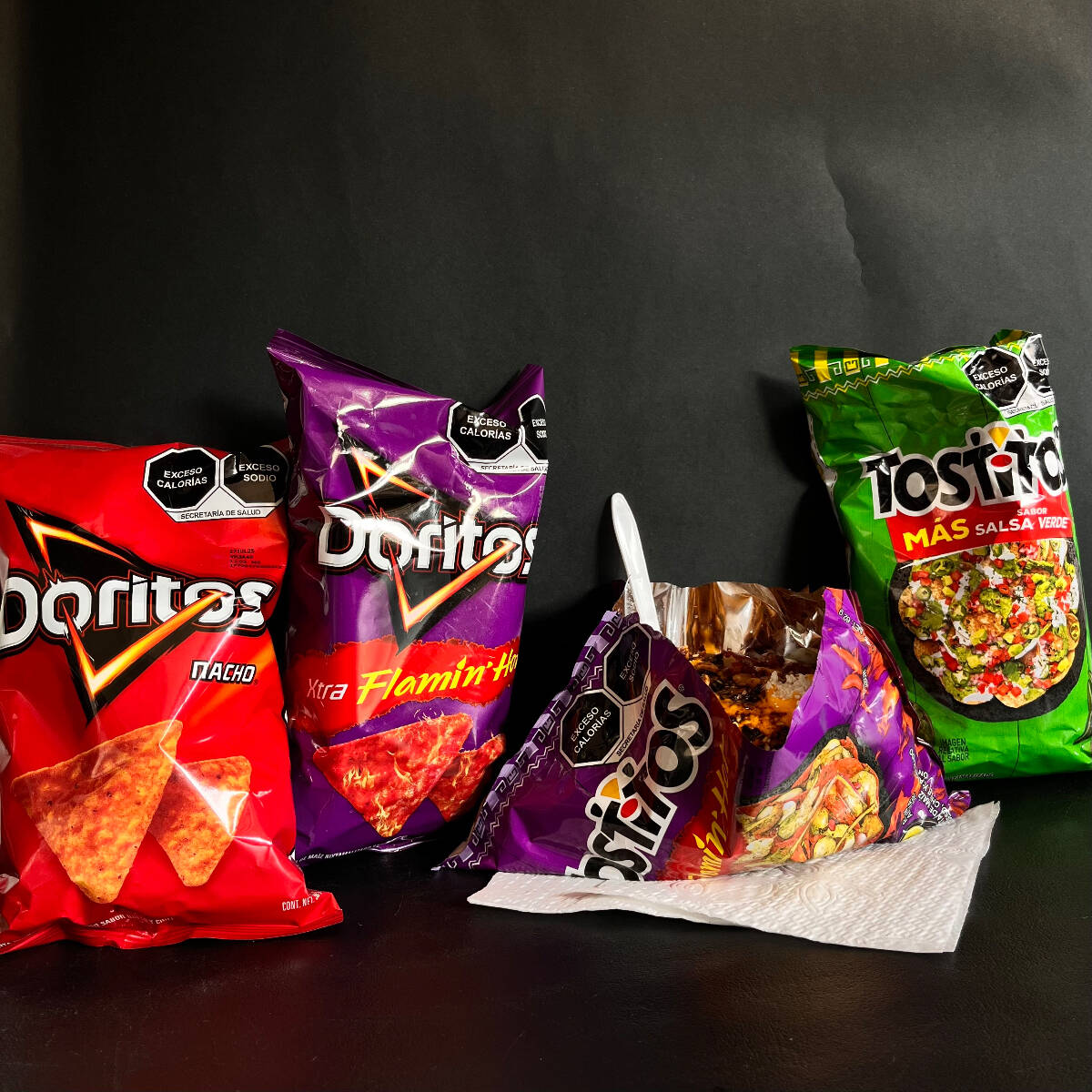 Especialidad ChiquiExclusiva, cama de maruchan cubierta con esquites preparados, unas Sabritas hasta arriba y deliciosa arrachera marinada
