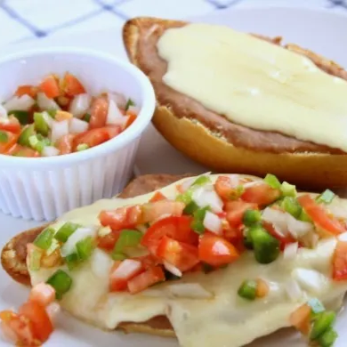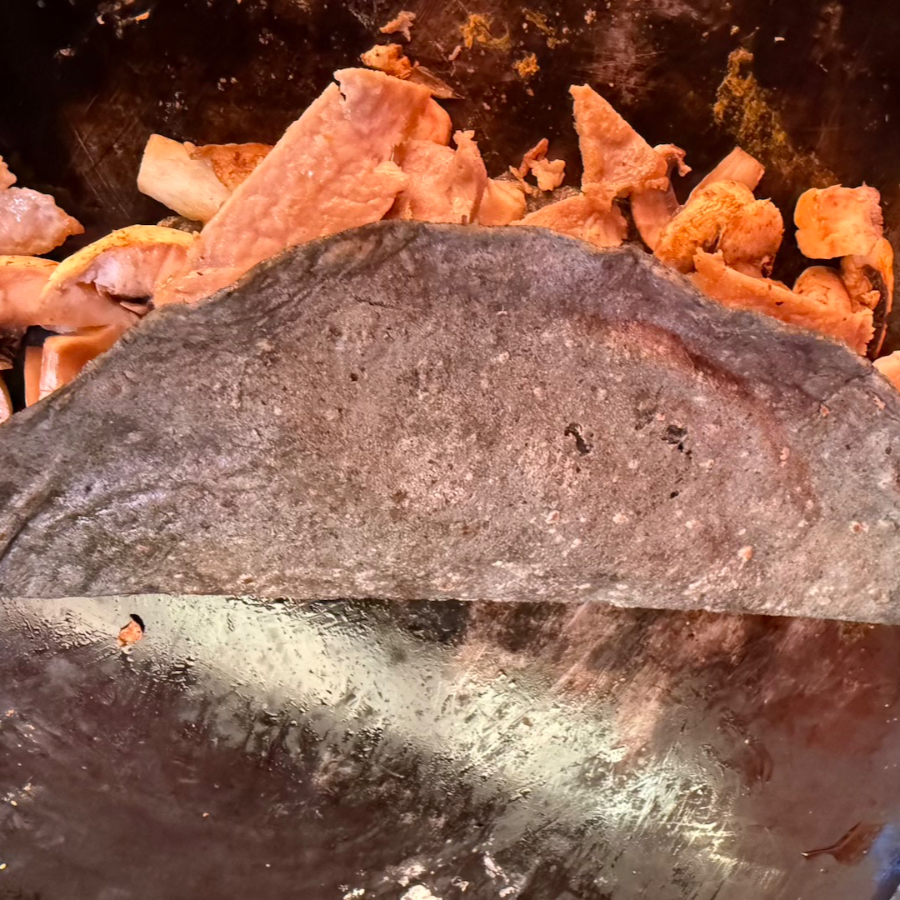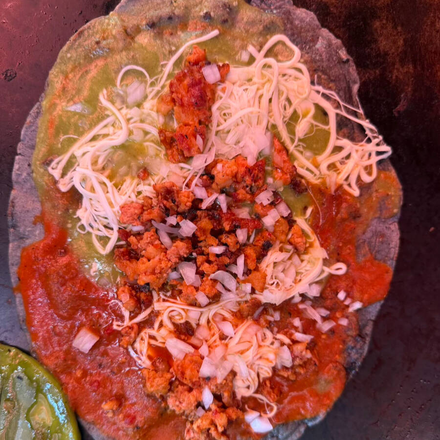 Servido en una tortilla de masa azul, acompañado de Papas, Nopales, Arroz, Longaniza, Frijoles