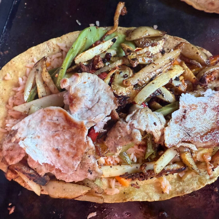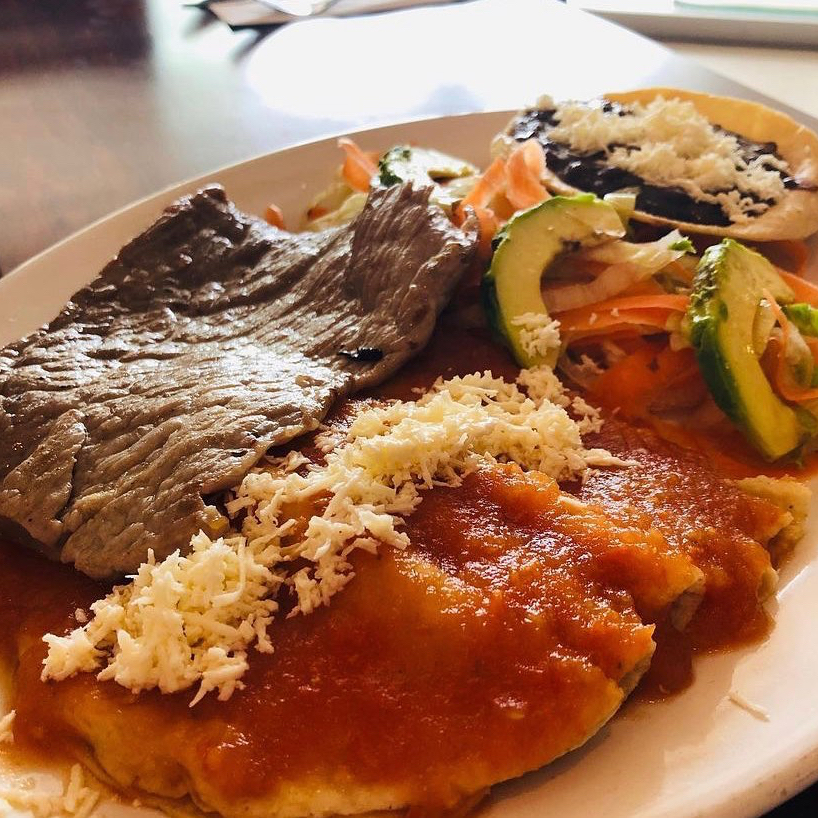 Servido en una tortilla de masa azul, acompañado de Papas, Nopales, Arroz, Bistec y Longaniza, Frijoles