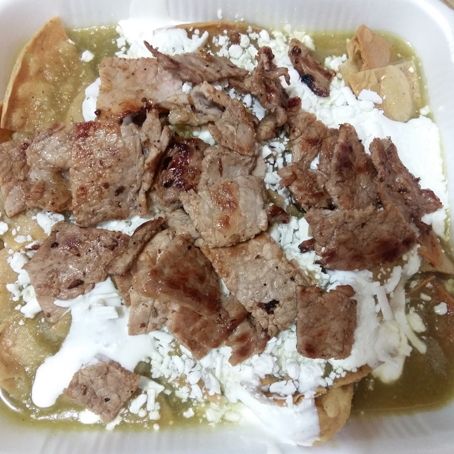 Desayuno completo, Chilaquiles verdes con bistec servidos con frijoles refritos, incluye fruta y cafe.