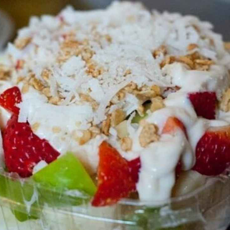 Coctel de frutas de Temporada, Papaya, Melon, Plátano, Piña, fresa con Crema Batida, Miel y Granola