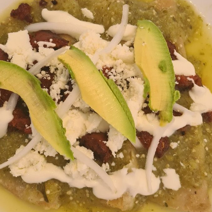 Desayuno completo, Enchiladas verdes con Longaniza, servidas con frijoles refritos, incluye fruta y cafe.