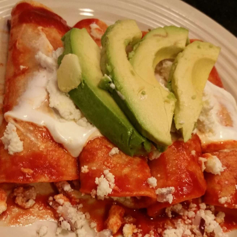 Desayuno completo, Enchiladas rojas con Bistec, servidas con frijoles refritos, incluye fruta y cafe.