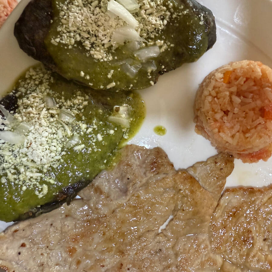 Carne asada con 2 Tlacoyos de frijol y arroz