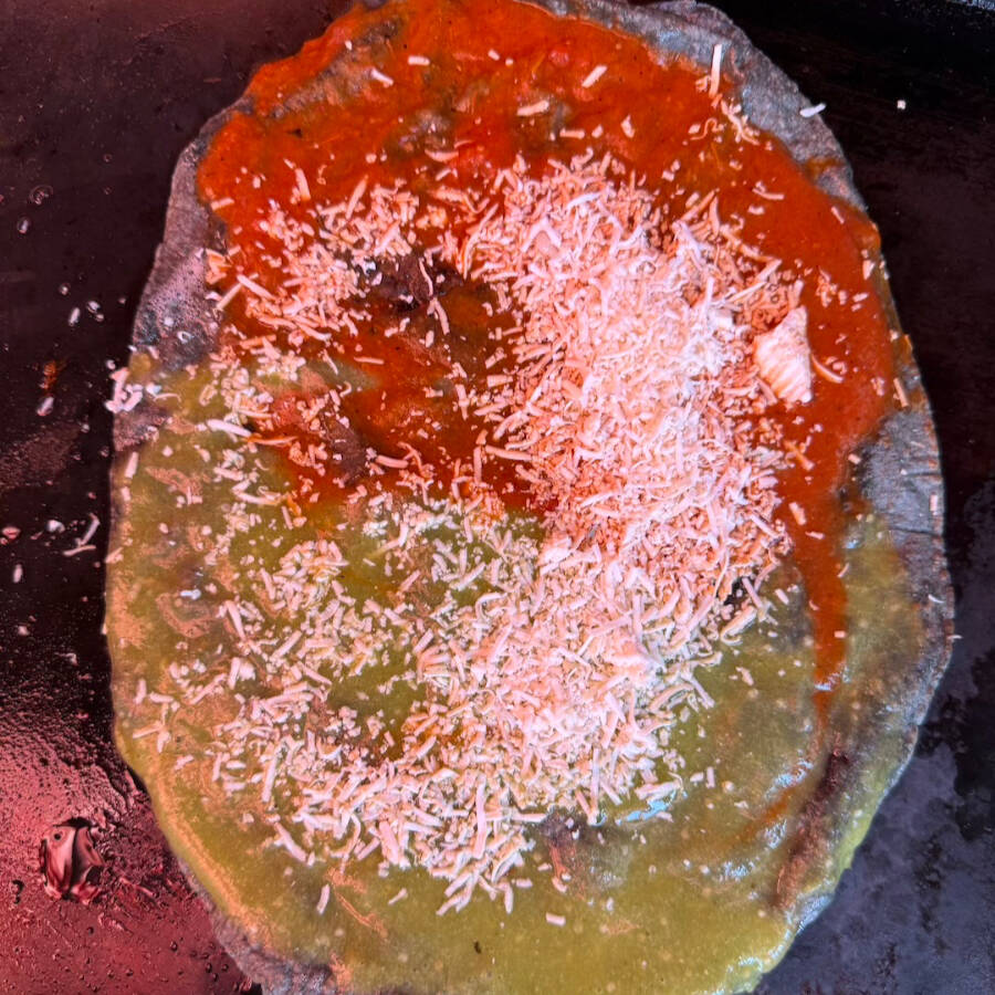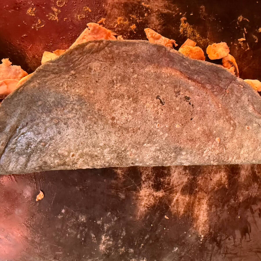 Quesadilla de maza azul con Longaniza, Bistec y Quesillo