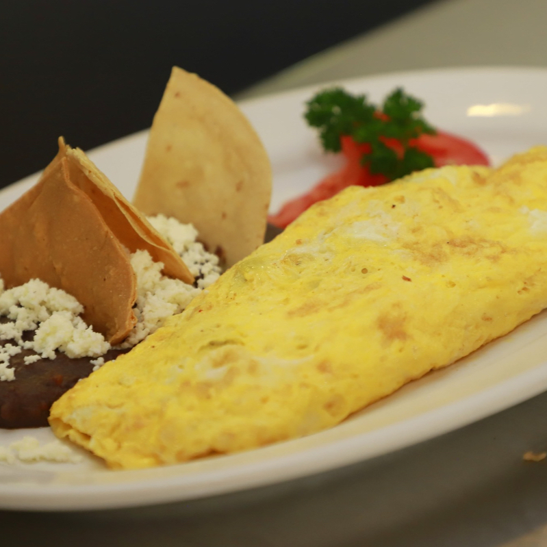 Desayuno completo, Omelette relleno de verduras sazonadas. acompañados de frijoles refritos y pico de gallo. Incluye fruta y cafe de olla.