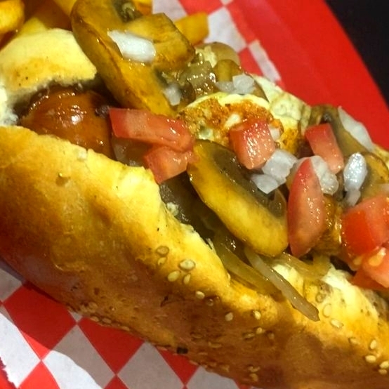 Salchicha de res premium, champiñones frescos sazonados, queso líquido, cebollas salteadas a la mantequilla y costra de queso gouda y quesillo.