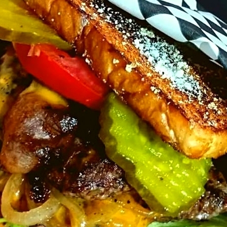 Pan tostado con mantequilla y parmesano, doble carne, queso, tocino, mozzarella y cebollas salteadas a la mantequilla.
