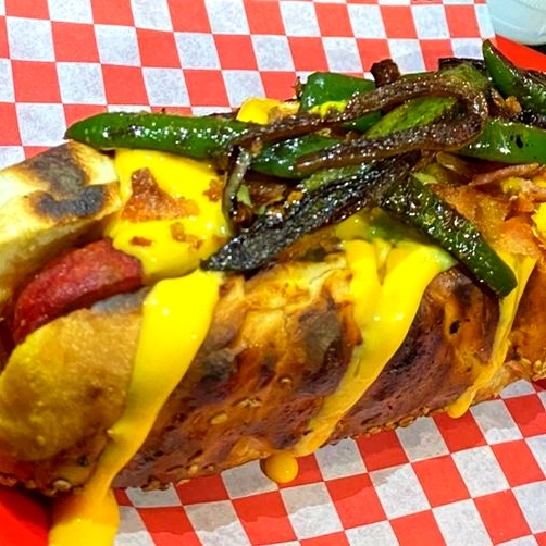 Salchicha de res premium, quesillo, pimientos salteados y BBQ.
