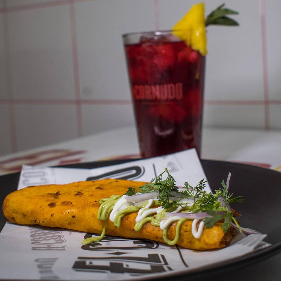 Volcán de tortilla dorada con queso, birria y guacamole, porque a veces el fuego no se apaga.