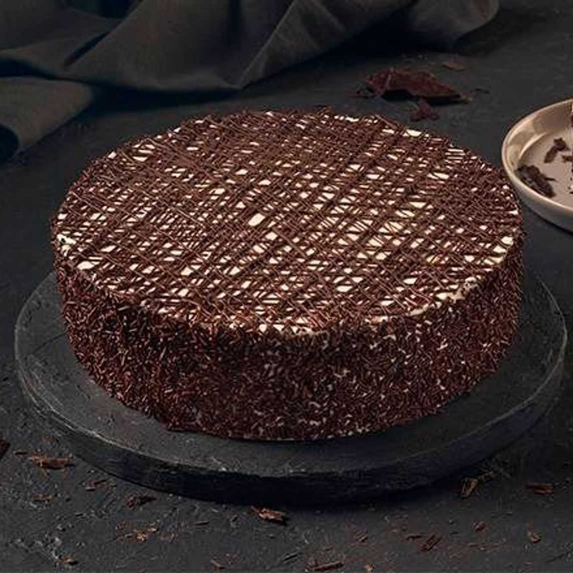 Delicioso pastel elaborado con bizcocho de chocolate con trocitos de nuez, embebido con licor de amaretto, relleno con crema de almendra y decorado con líneas de chocolate.