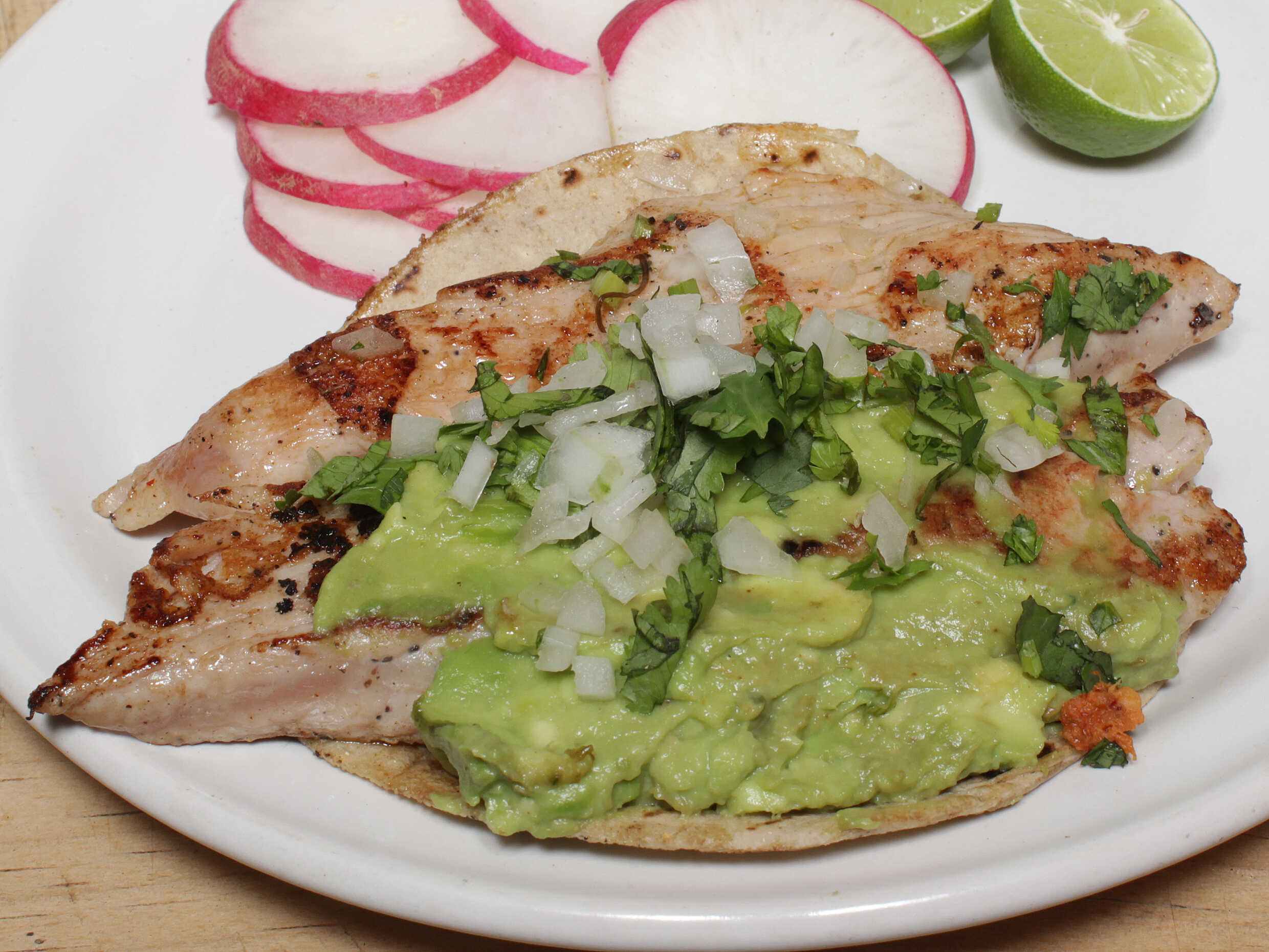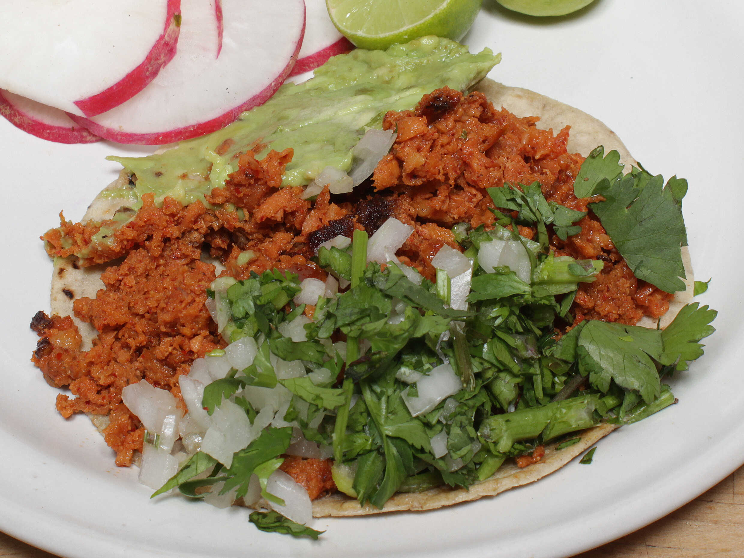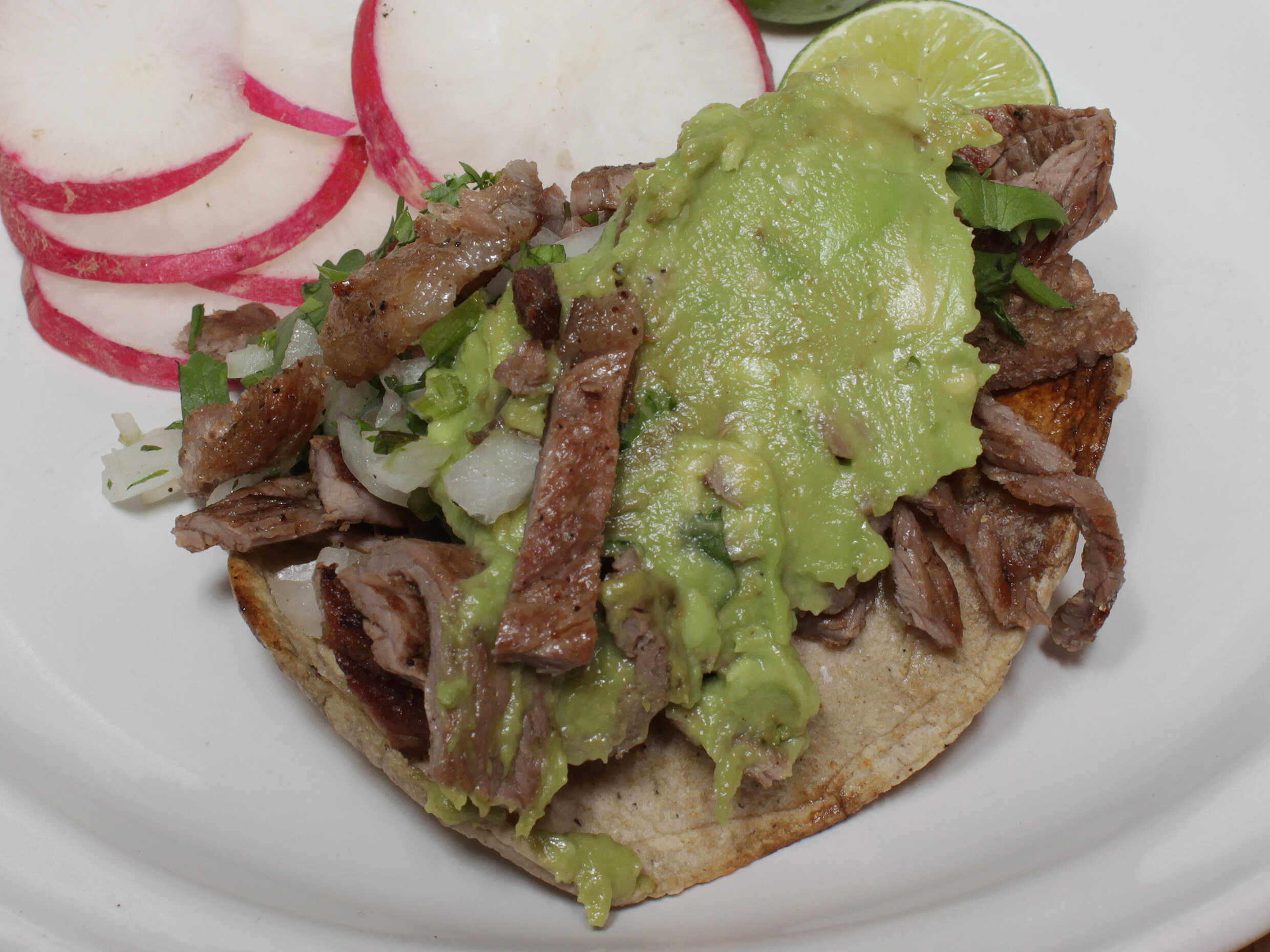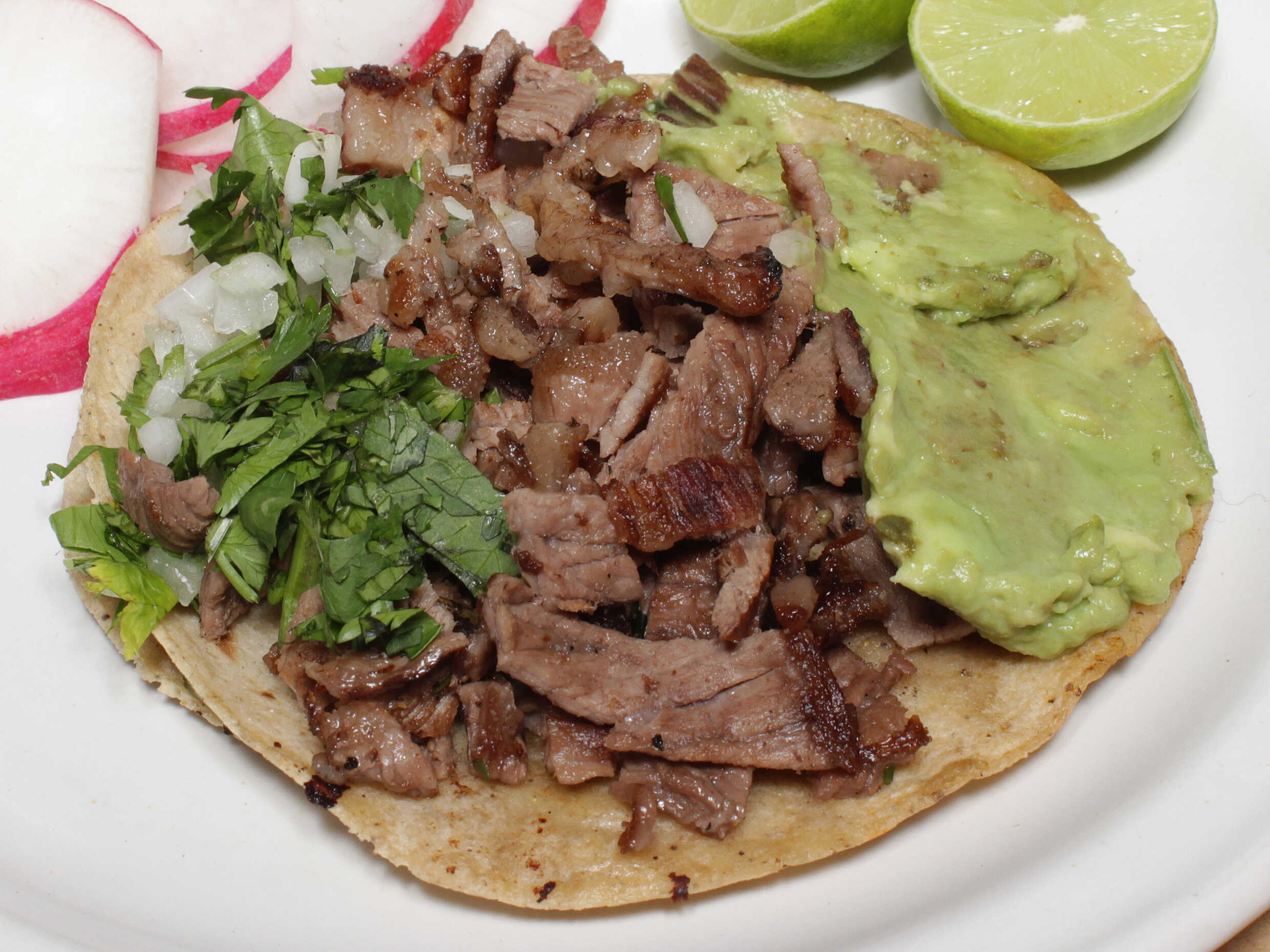 Tortilla de maíz carne o longaniza cilantro cebolla aguacate limones y salsas.