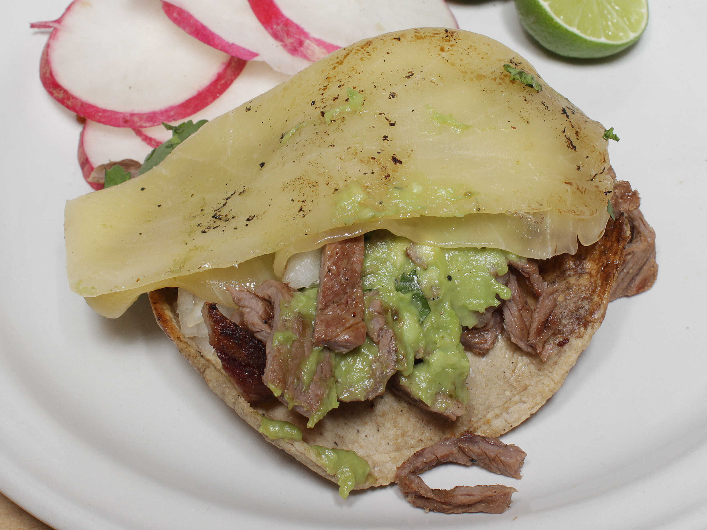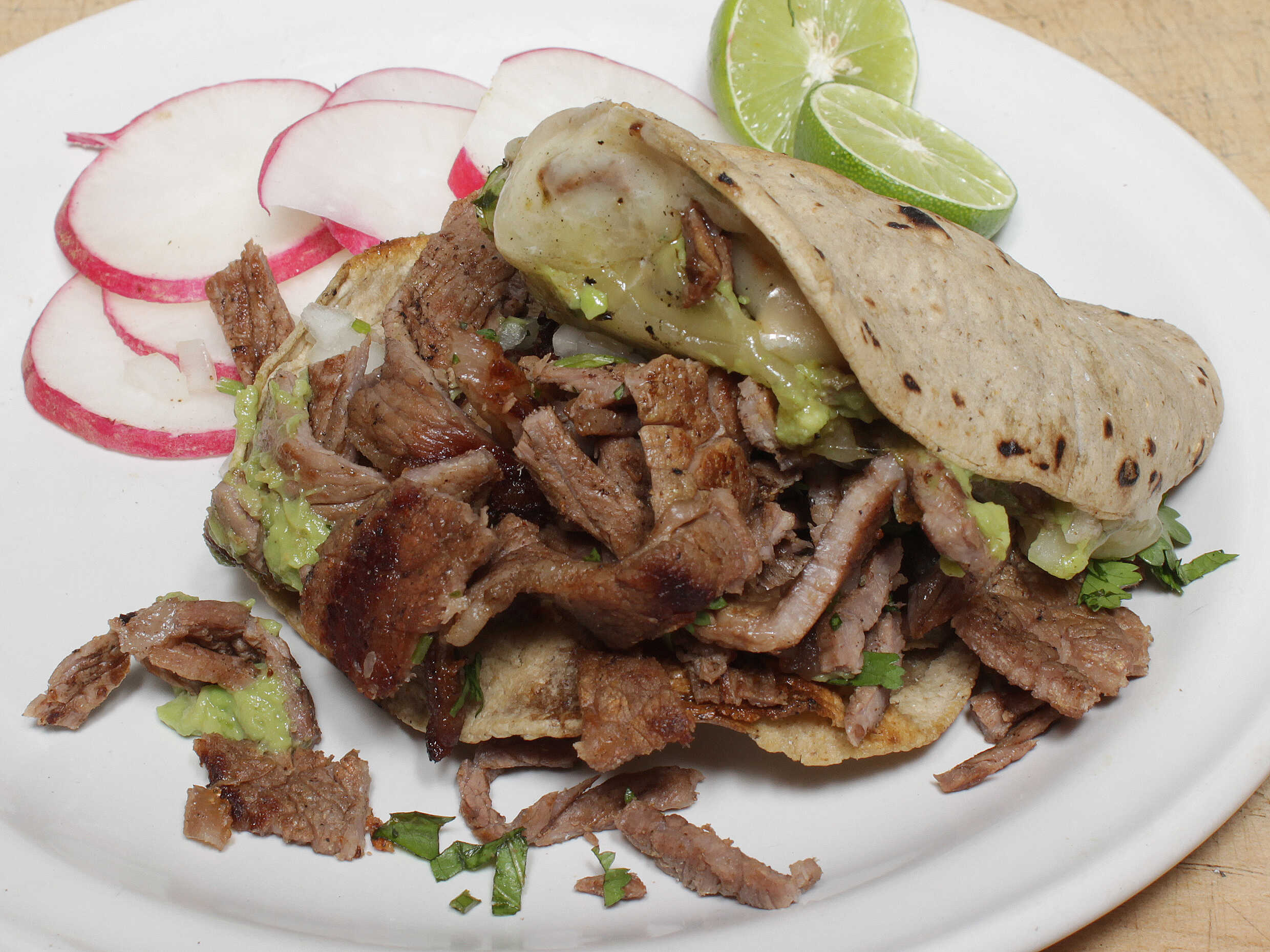 Carne asada queso manchego cilantro cebolla aguacate limones salsas.