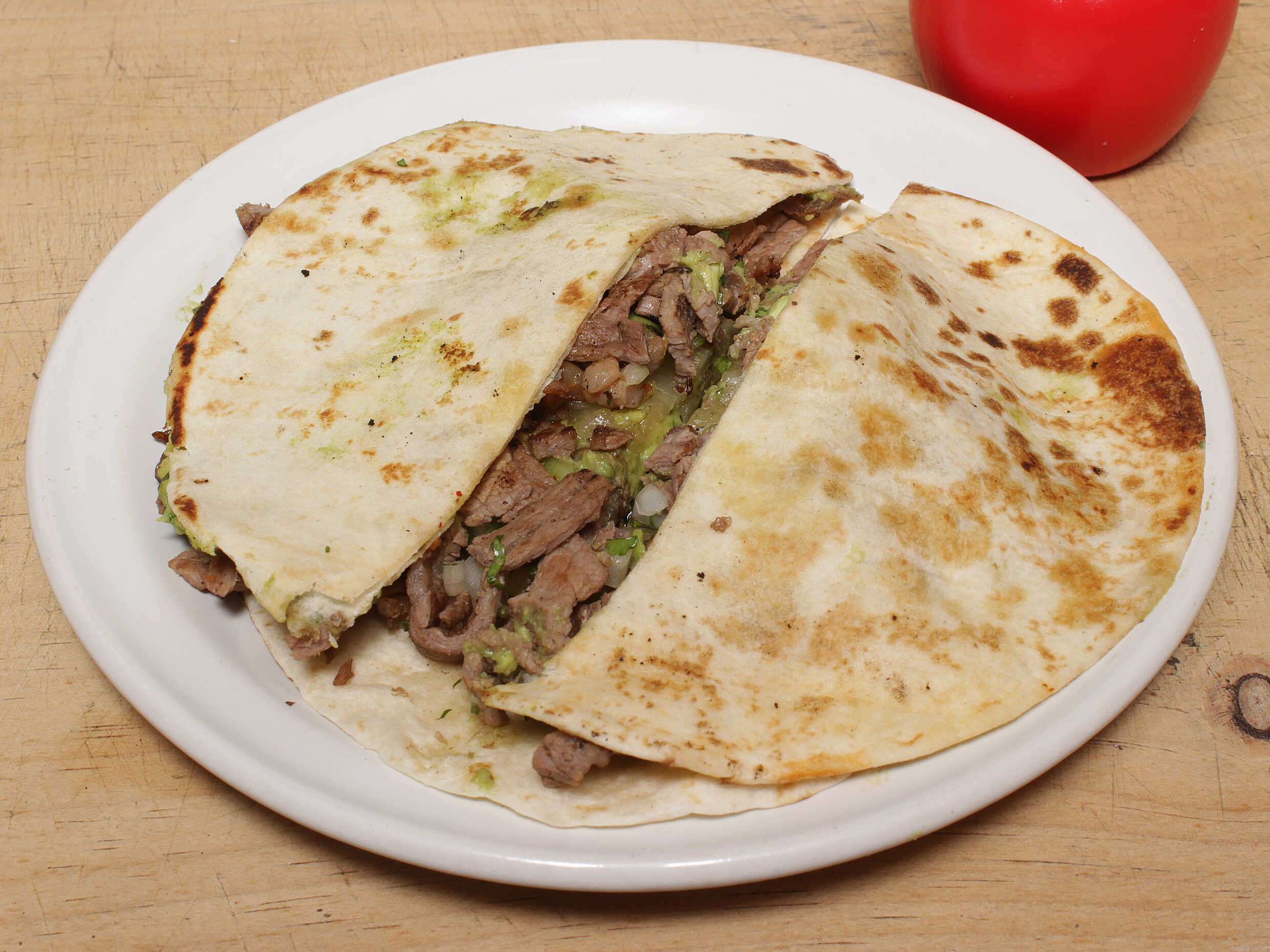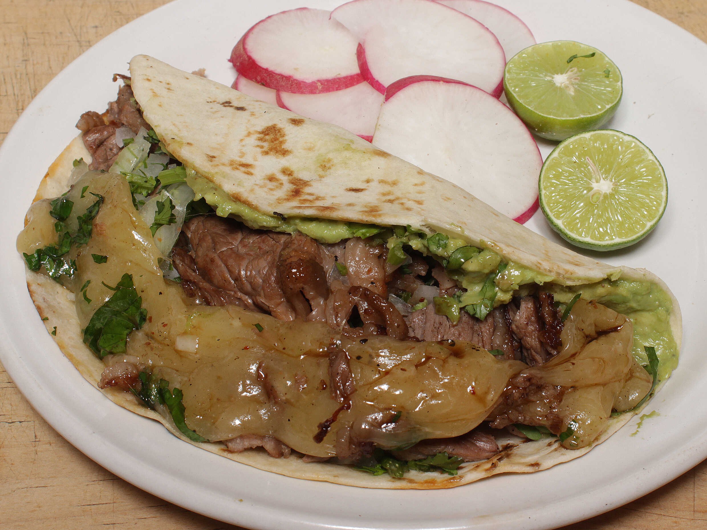 2 Tortillas harina carne o longaniza queso manchego derretido cilantro cebolla aguacate limones salsas.
