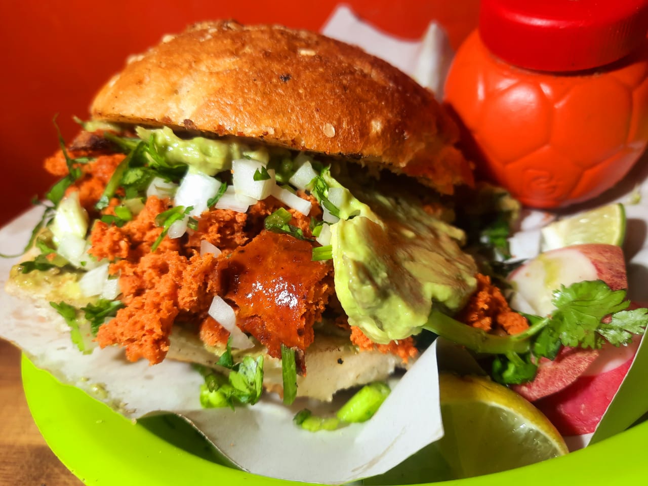 Cemita longaniza cilantro cebolla salsas aguacate limones.