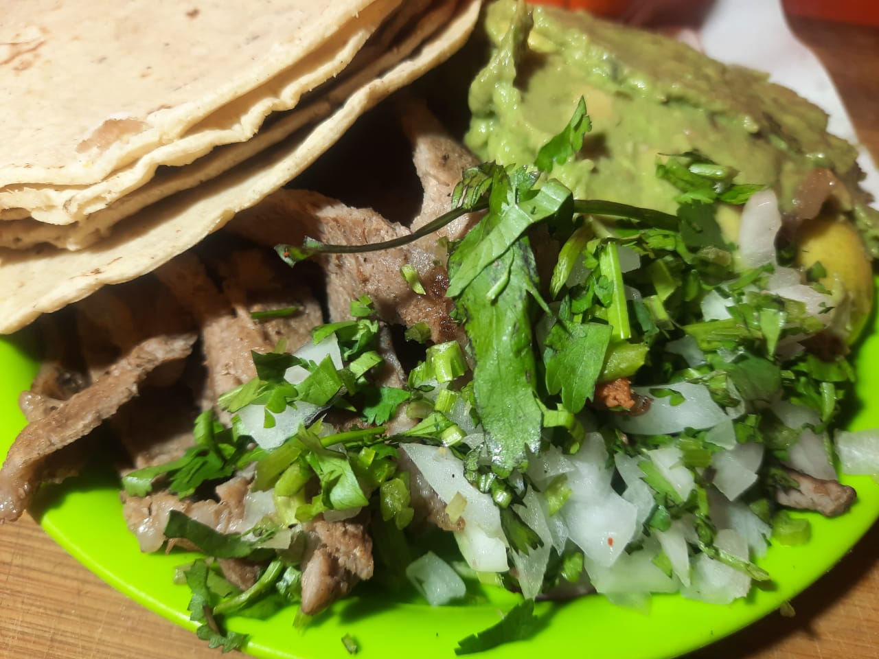 Carne (cebolla, cilantro y aguacate).