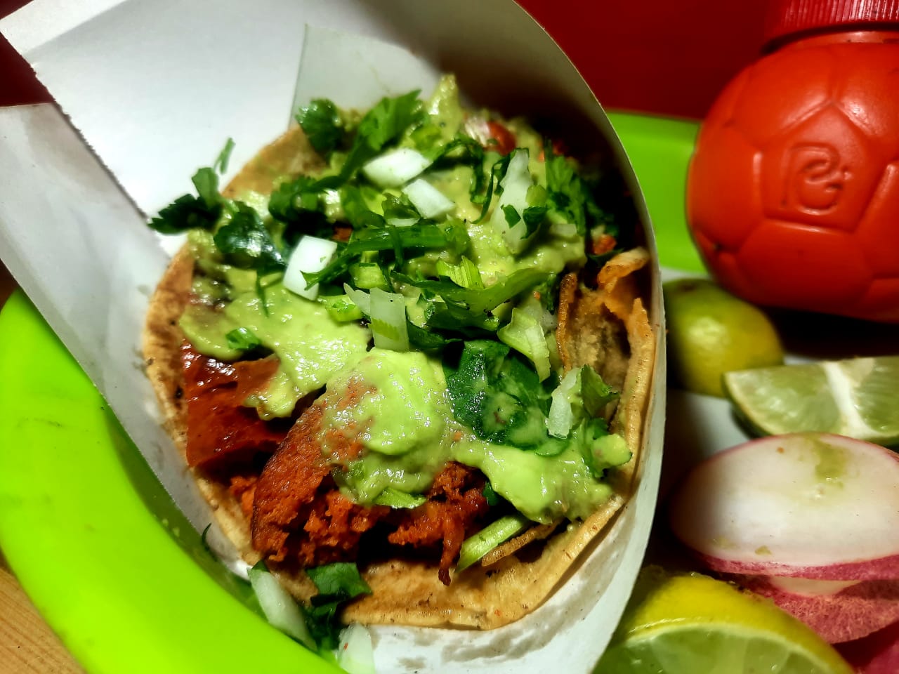 Carne cilantro cebolla aguacate salsas limones