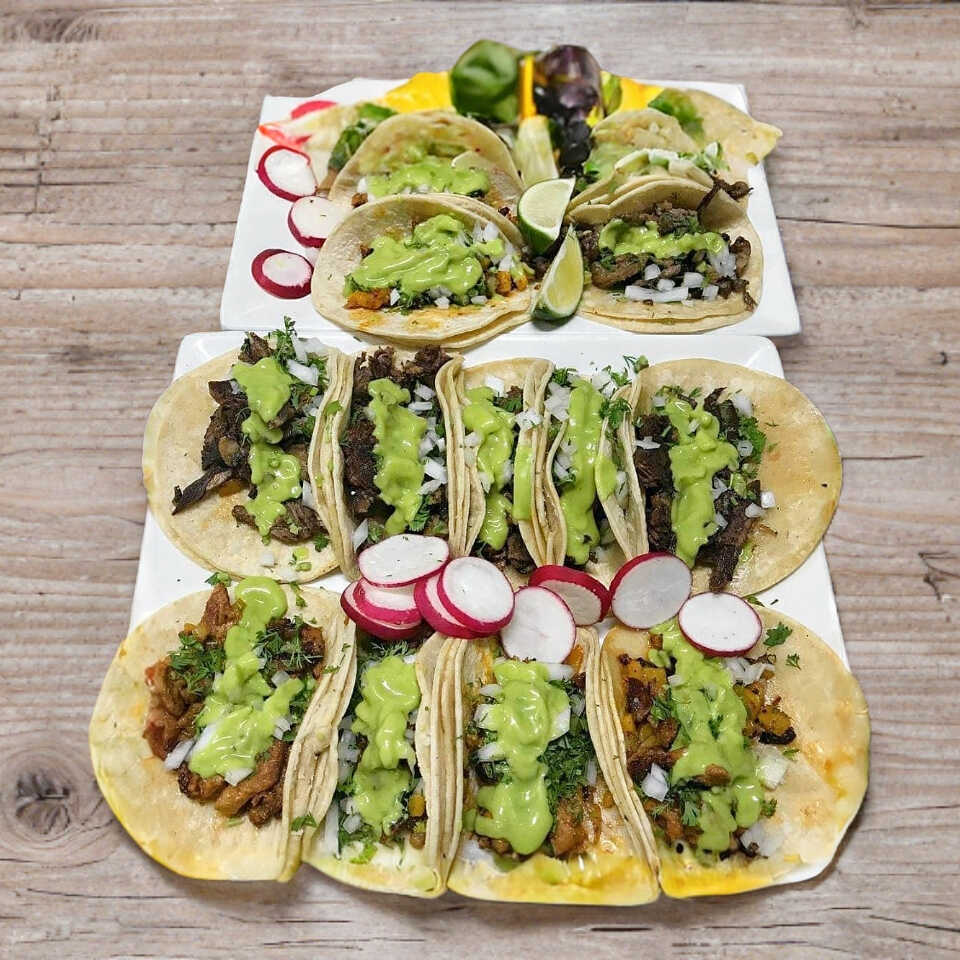 5 Tacos contiene: tortillas taquera, proteína a elegir, cilantro, cebolla, aguacate, salsas, limones y una bebida de 250ml