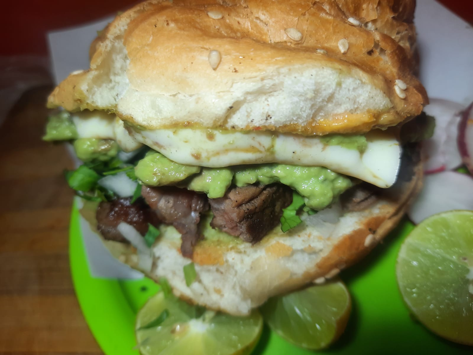 Cemita carne asada chorizo cilantro cebolla aguacate salsas limones.