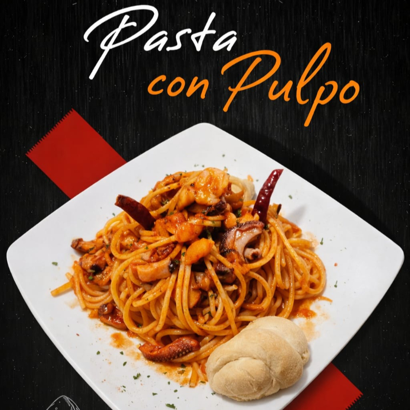 Deliciosa pasta con tocino, ajo, peperoncino y salsa pomodoro.