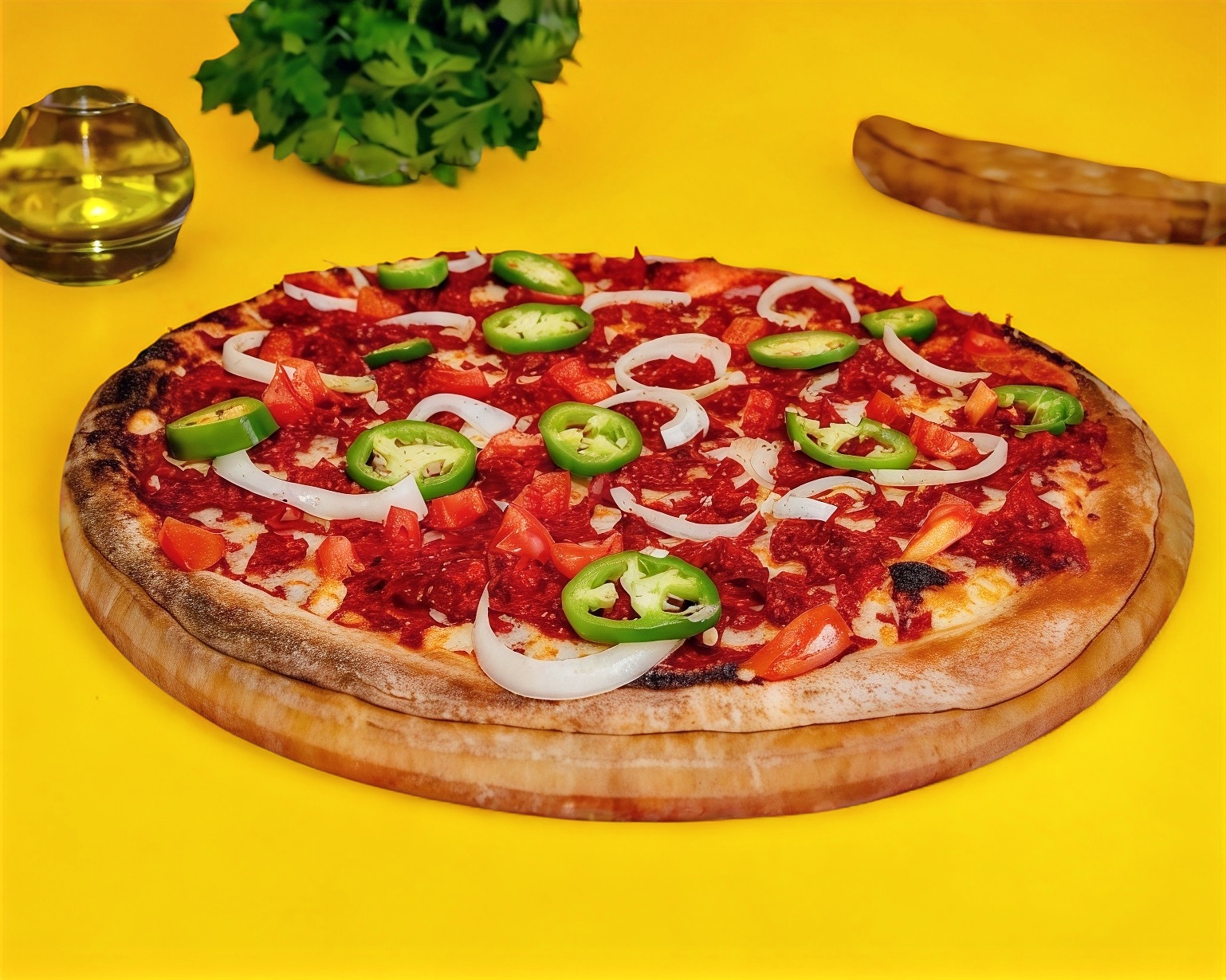 8 Rebanadas de Queso mozzarella, champiñones, pimientos, tomates, cebolla, brócoli, jalapeño, aceitunas y albahaca. Horneada a la leña.
