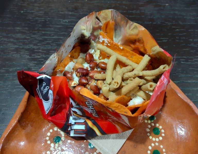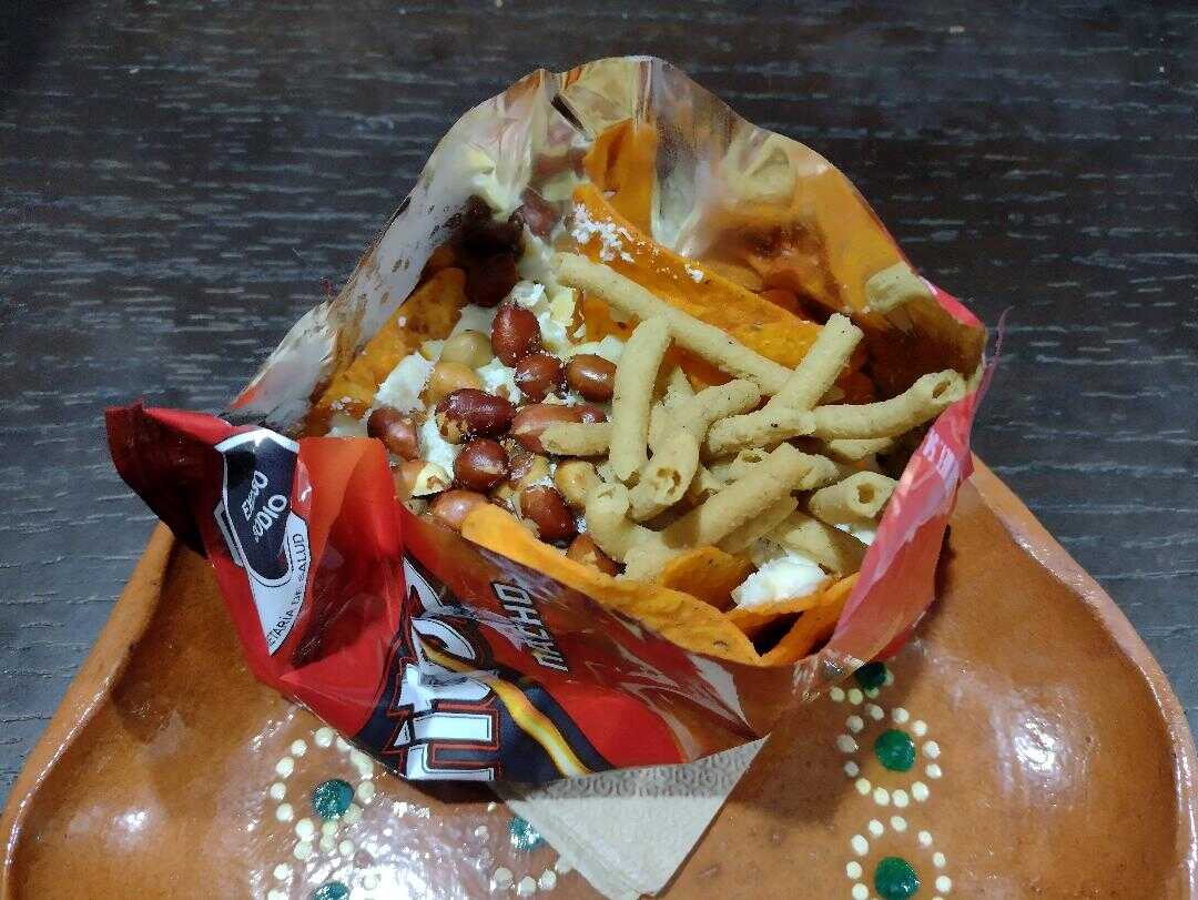 Usamos solo la marca Sabritas, cubiertos con esquite, mayonesa, queso añejo, salsas de la casa y como toppings cacahuates y fritura tipo churro