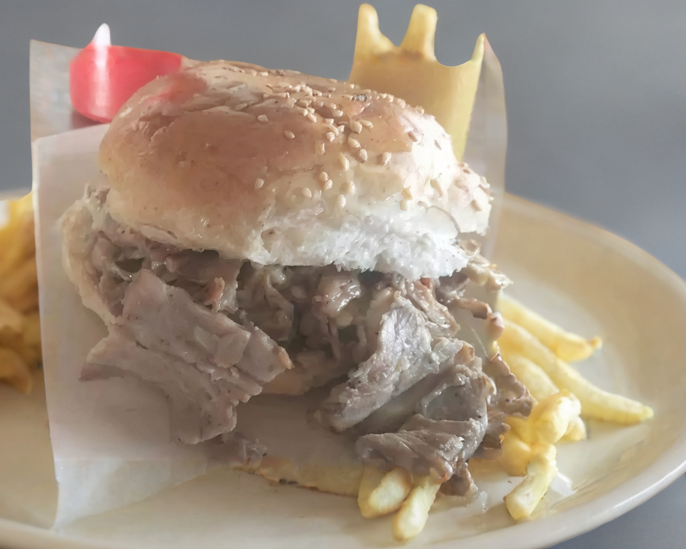 Pan blanco con ajonjolí en la parte de arriba con carne árabe, queso manchego y oaxaca fundido, salsa roja tradicional.
