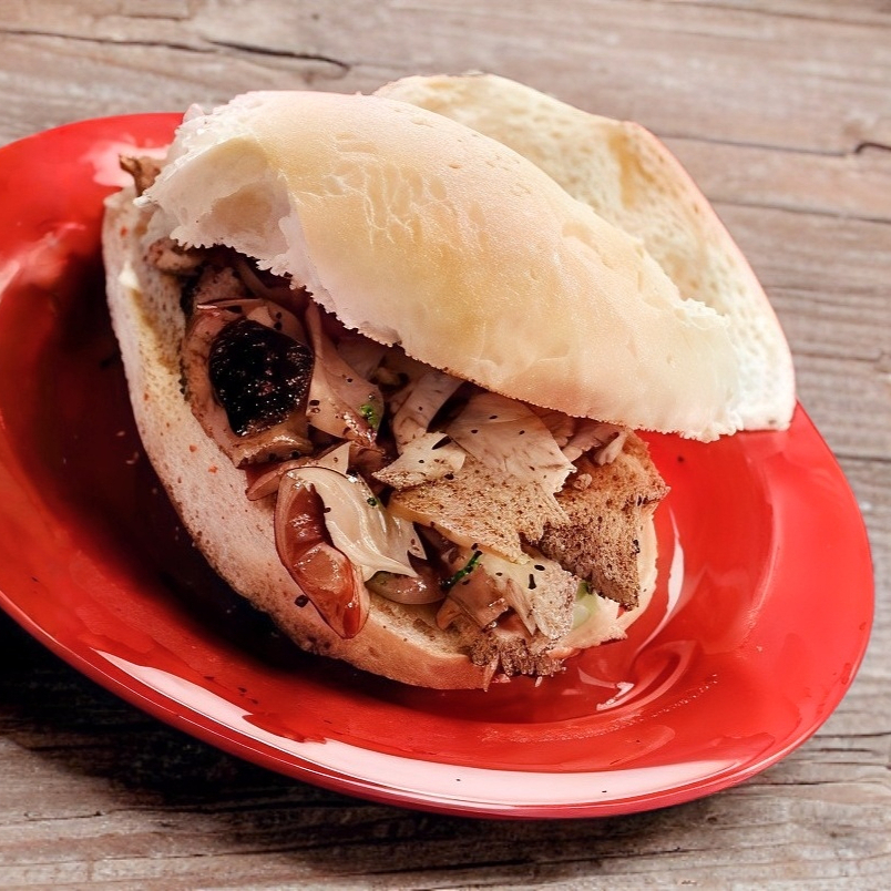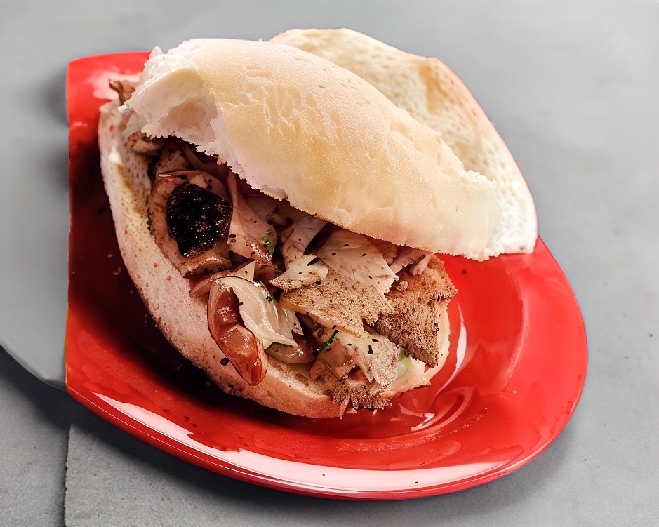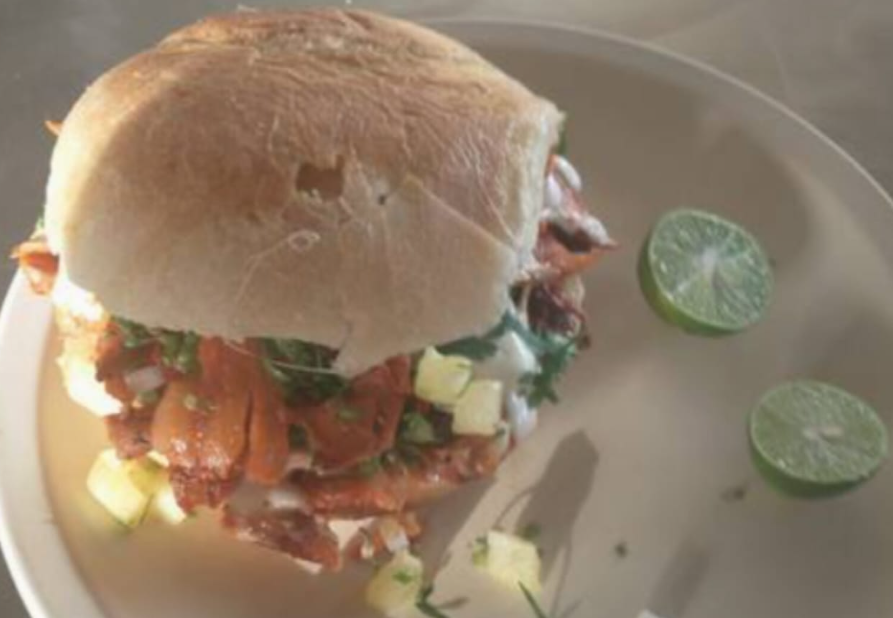 Pan blanco con carne al pastor, queso manchego y oaxaca fundido, salsa roja tradicional.