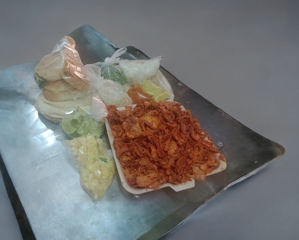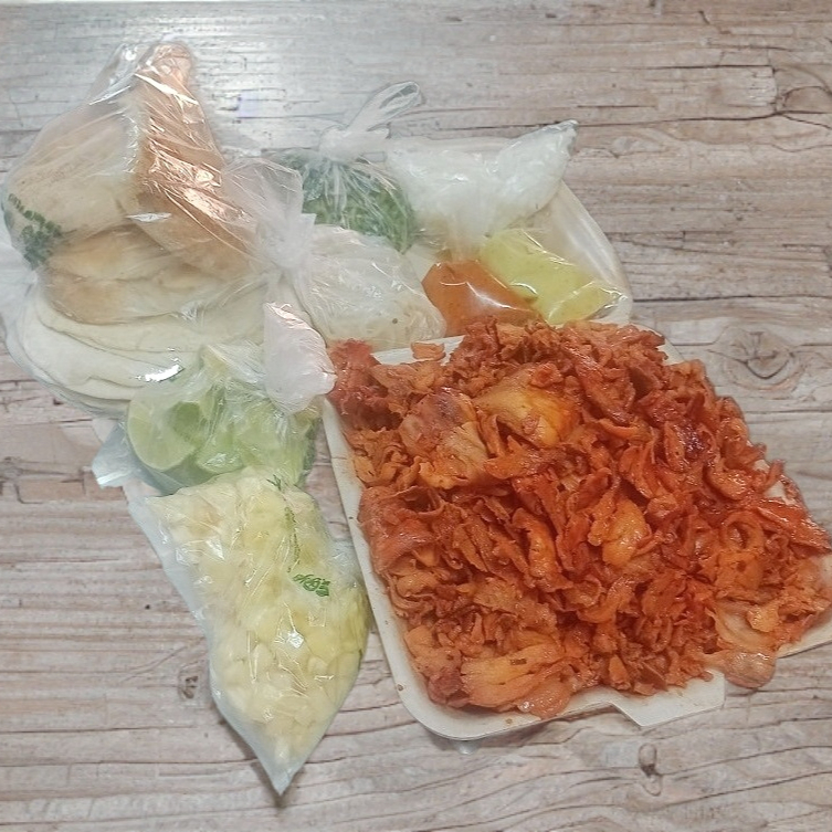 3-4 personas ,elegir tu preparación : 1/2 kg de carne al pastor, 5 tortillas de harina, 5 tortillas de maíz, cilantro, cebolla y piña, 1 cemita, salsa verde y limones