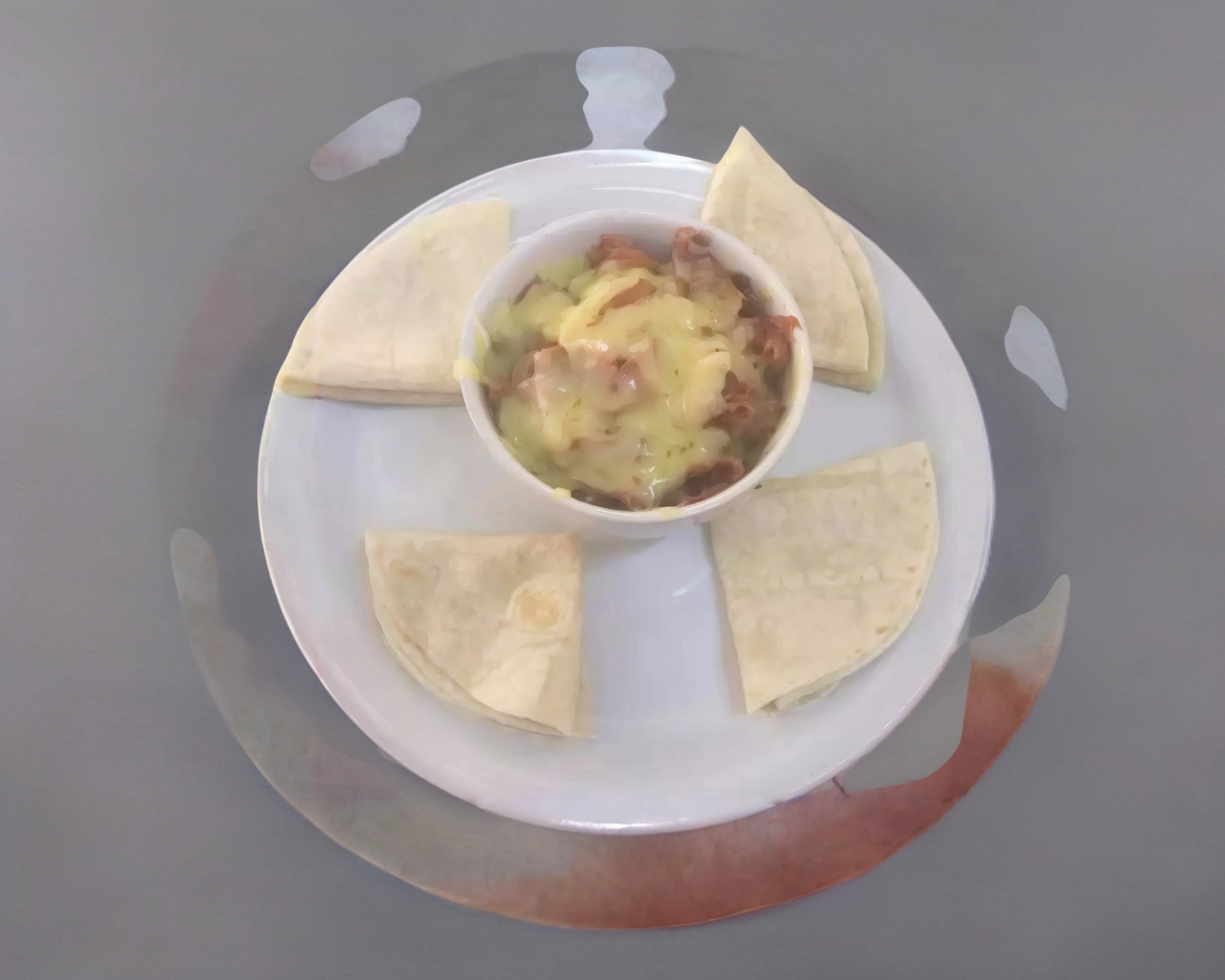 Queso manchego y oaxaca fundido , 3 tortillas de harina, salsa roja tradicional o verde.