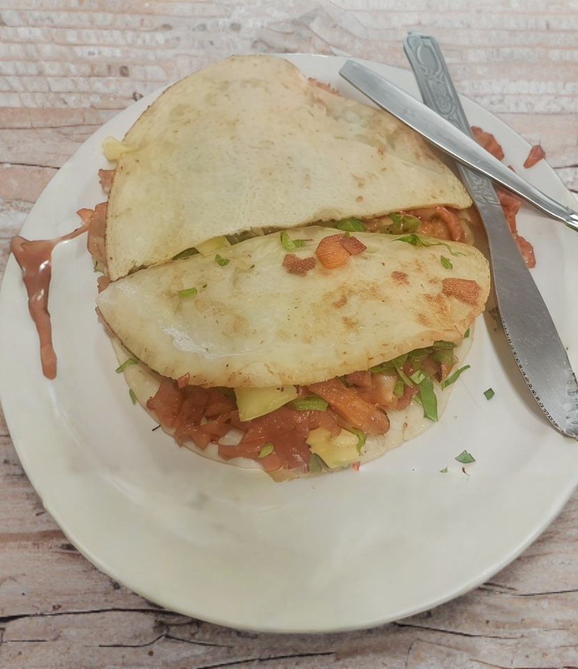 Tortilla de harina y carne al pastor, queso manchego y oaxaca fundido, verdura y piña al gusto, salsa colorada o verde.