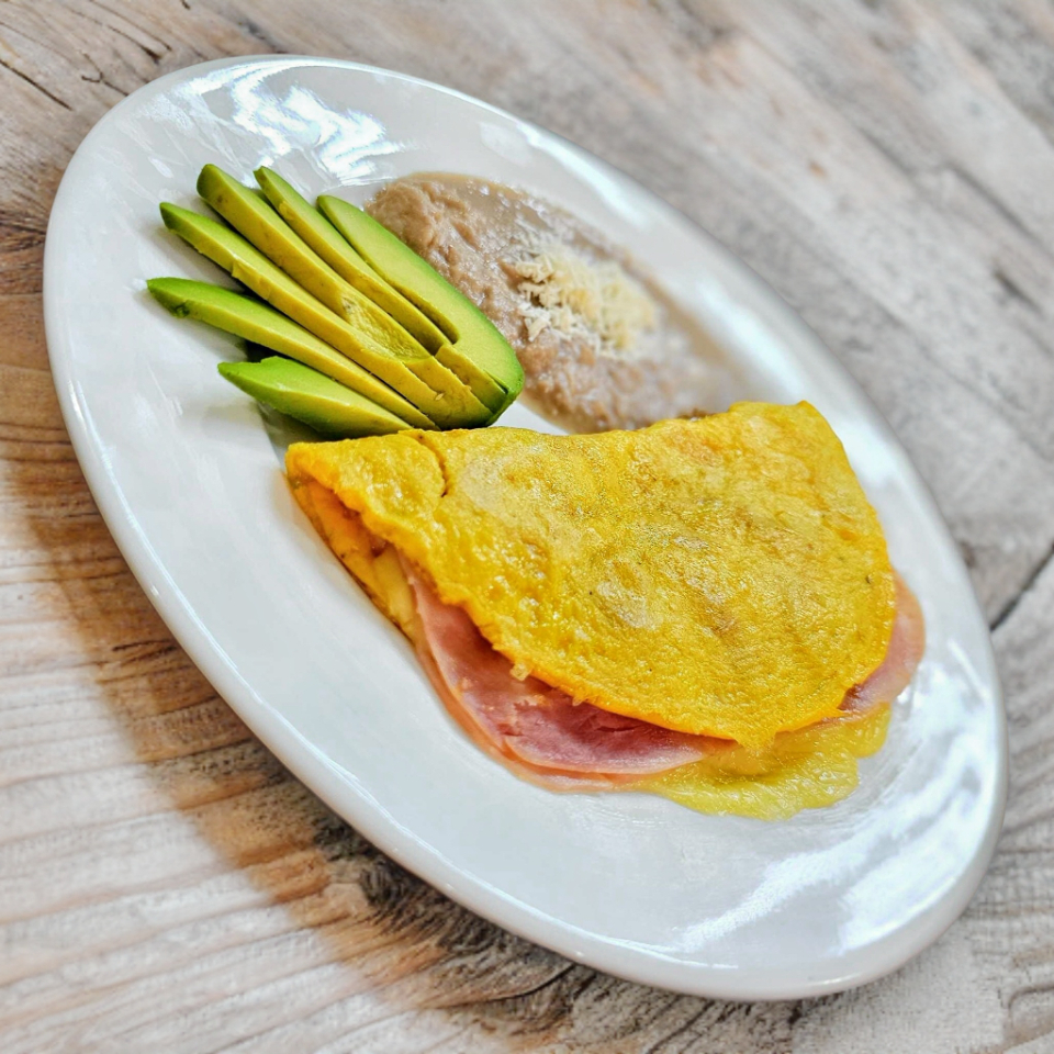 Relleno de jamón de pierna y queso manchego, acompañado de frijoles refritos, aguacate, salsa y acompañamiento a elegir.