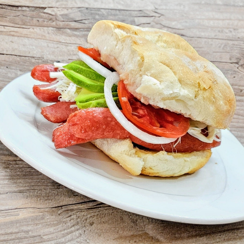 Sándwich con salchicha, mayonesa, lechuga, quesillo, queso amarillo, aguacate, jitomate y picante a elegir.