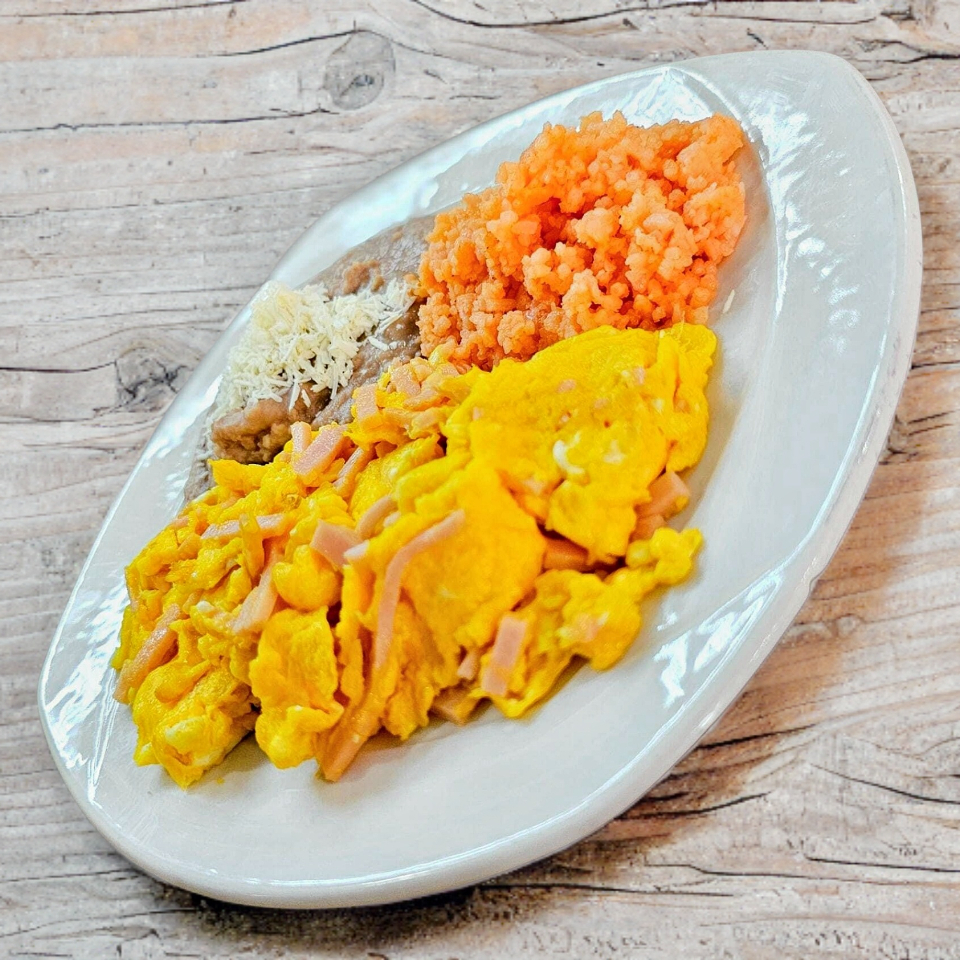 Huevos revueltos con ingrediente a elección, acompañados con arroz y frijoles refritos.