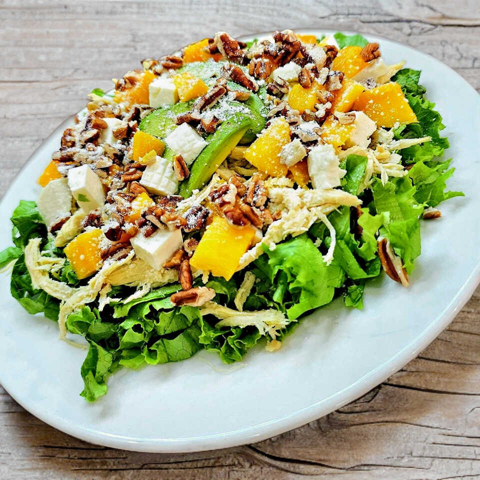 Ensalada con lechuga, mango, aguacate, queso panela, parmesano, nuez, pollo deshebrado, y aderezo.