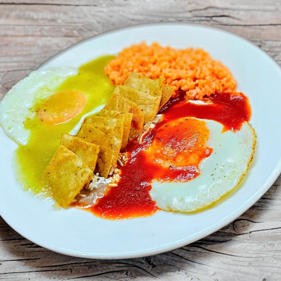 Chilaquiles con salsa a elección, pechuga asada, huevo, chistorra, cebolla, crema, aguacate y queso añejo.