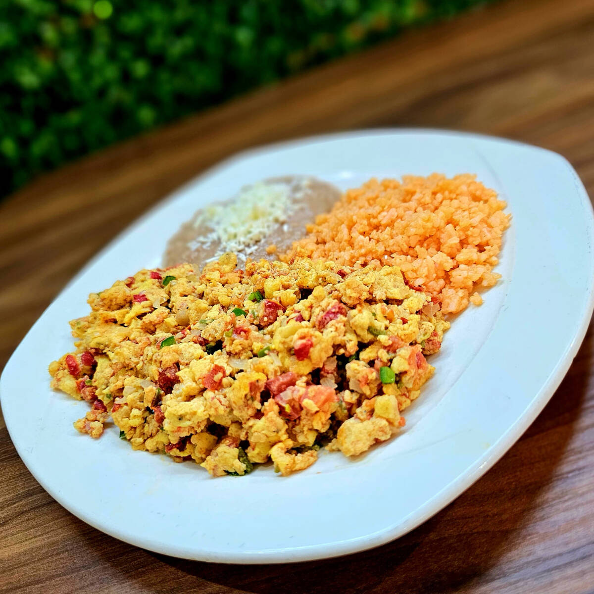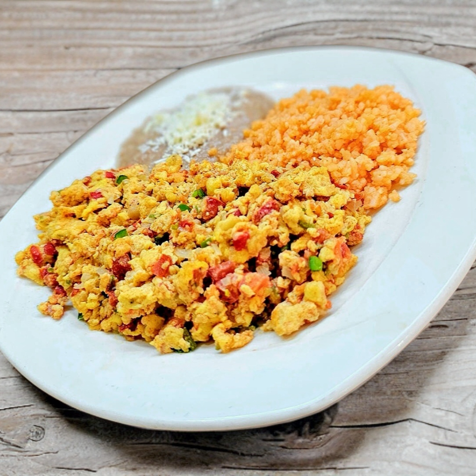 Huevos con cebolla, jitomate, chile, acompañados con arroz y frijoles refritos con queso añejo.