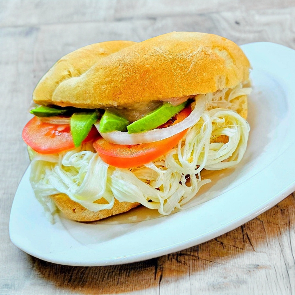 Torta con quesillo, frijoles, aguacate, jitomate, cebolla y picante a elegir.