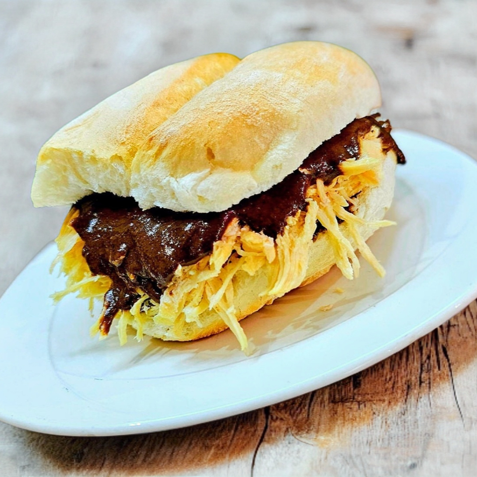 Torta con mole poblano y pechuga de pollo.