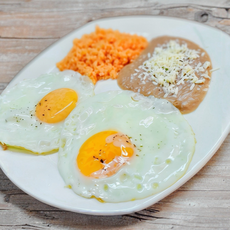 Huevos estrellados, acompañados de arroz y frijoles refritos con queso añejo.