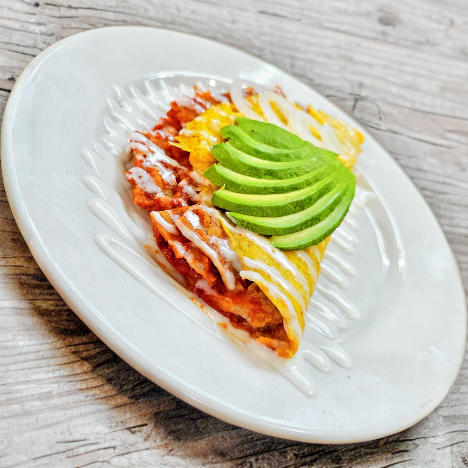 3 enfrijoladas rellenas de pechuga deshebrada, queso añejo, cebolla, crema, aguacate y picante a elegir.