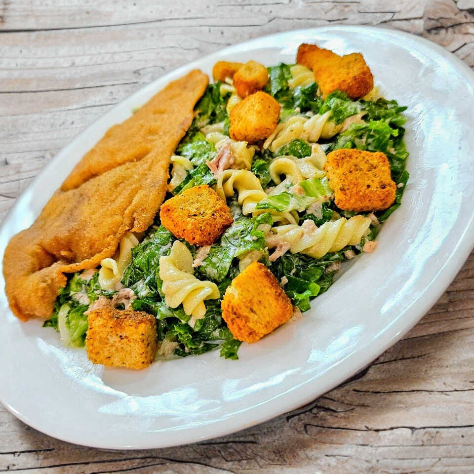Ensalada con lechuga, pasta, atún con mayonesa, milanesa pollo, crutones.