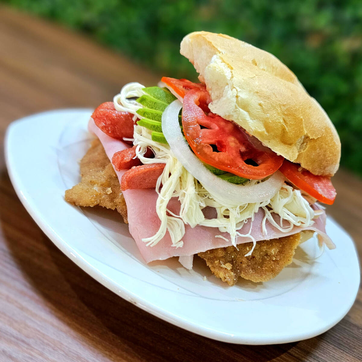 Torta con milanesa de cerdo, jamón, salchicha, mayonesa, aguacate, frijoles, quesillo, jitomate y cebolla, picante a elegir.